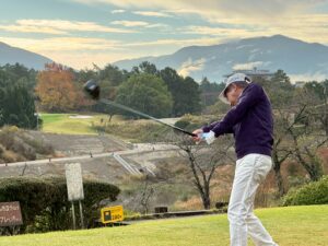 始球式では定会長の力のこもったドライバーショットが放たれ、総勢156名(42組)が紅葉が色づきつつあるコースでプレーされました。